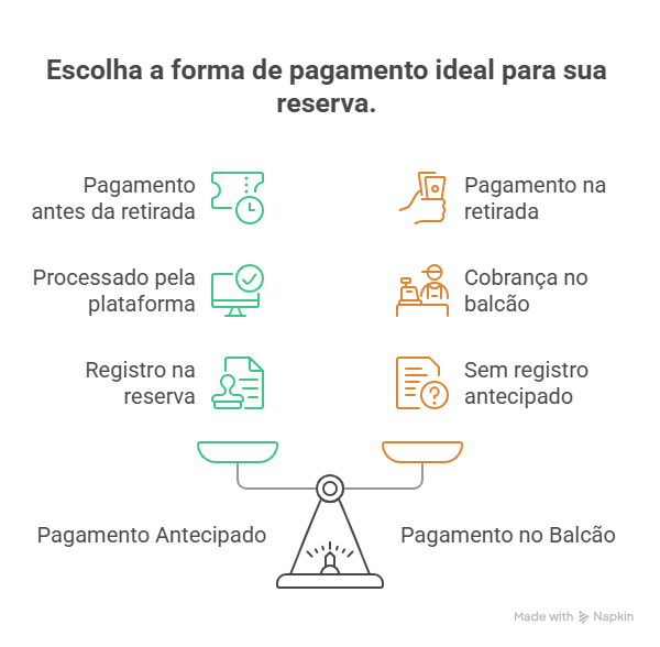 O pagamento no balcão é quando o valor da reserva é pago no momento da retirada do veículo.